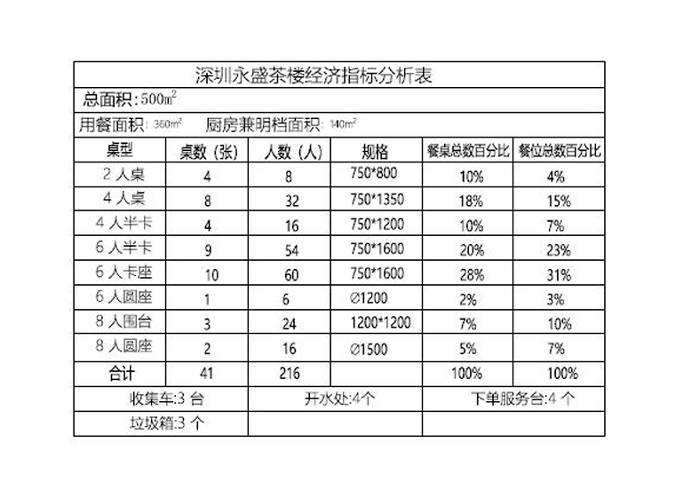2、坪效計(jì)算:坪效重點(diǎn)就是考慮位置的利用率和位置的分布狀況。通過我們的研究發(fā)現(xiàn),深圳、廣州等地茶樓用餐座位利用率最高的多數(shù)是4人位和6人位。而在上海等地,最多應(yīng)該是4人位和2人位。我們不僅要關(guān)注位置的數(shù)量,更應(yīng)該綜合考慮位置的利用率。如果長期出現(xiàn)4個(gè)人的客人卻使用6人桌位,說明位置的實(shí)際實(shí)用率才70%而已,這是極度不合理的坪效。我們悅得閑的餐區(qū)位置6人位為主,4人位可以臨時(shí)拼接成8人位,甚至更多的位,滿足顧客的多樣化需求,提升餐區(qū)的位置利用率。