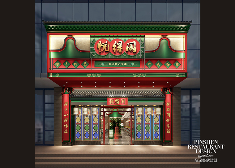 8、門頭形象:門頭是品牌的臉面,也是顧客接觸我們的第一個(gè)場景。門頭形象具有廣而告之的作用,門頭代表著餐廳的名字叫什么,賣的產(chǎn)品是什么,這是最基本且不可或缺的要素。門頭完全可以作為全方位展示店特色的工具,巧妙的組合可用信息向客戶發(fā)送品牌信息,從而引發(fā)客戶興趣。悅得閑廣式點(diǎn)心茶樓的門頭大量使用鑊耳山墻,讓廣式茶樓的特性展露無遺。