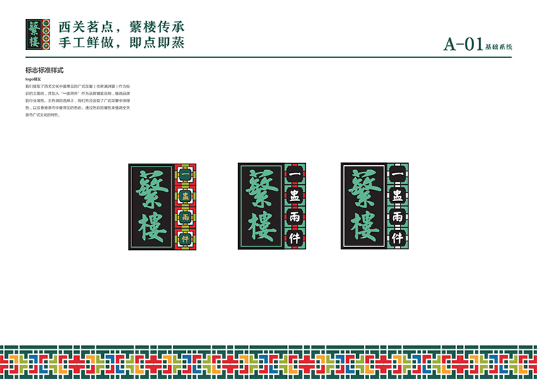 蘩樓兩個字在日常中很少看見,認(rèn)識的人不多,但是一旦認(rèn)識了,識別度非常高。品深設(shè)計方法論認(rèn)為:優(yōu)秀的標(biāo)識logo首先應(yīng)該傳達(dá)品牌屬性,其次是承載品牌的文化,再次是很容易識別和傳播。我們提取了西關(guān)文化中最常見的廣式花窗(也稱滿洲窗)作為標(biāo)識的主圖形,并加入“一盅兩件”作為品牌輔助說明,強調(diào)品牌的行業(yè)屬性。