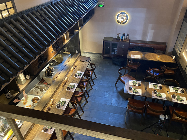 2、一樓大廳及吊頂的設計把京都的古老街道,巷子搬到我們店里。整個大廳的頂部環繞一圈日式黑瓦頂,四周幾個日式玻璃木窗,與地面的青石瓦面,墻體的稻草漆,燒烤吧臺形成一體化的京都風格。置身其中,仿佛漫步于京都的古老美食街道中,熙熙攘攘,熱鬧非凡,抬頭間還能看見二樓的日本侍女正在推開窗戶,朝著樓下觀望。
