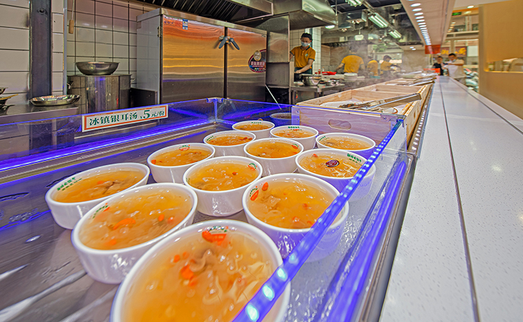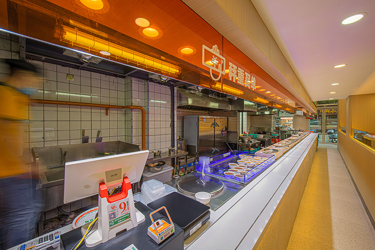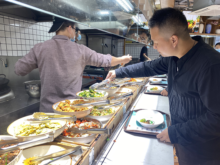 顧客進(jìn)門洗手,取餐盤自助選菜,找位置就餐,餐具回收,整個(gè)動(dòng)線清晰流暢,運(yùn)作一氣呵成。選菜臺(tái)的設(shè)計(jì)非常驚艷,30多到菜品排列成一行,在燈光照射,非常有吸引力。讓消費(fèi)者產(chǎn)生一種想全部吃一遍的沖動(dòng),進(jìn)而胃口大開,長期光顧我們。