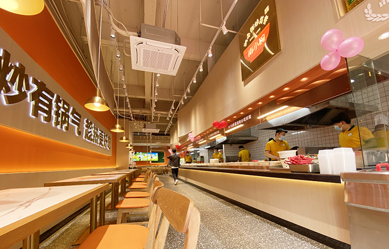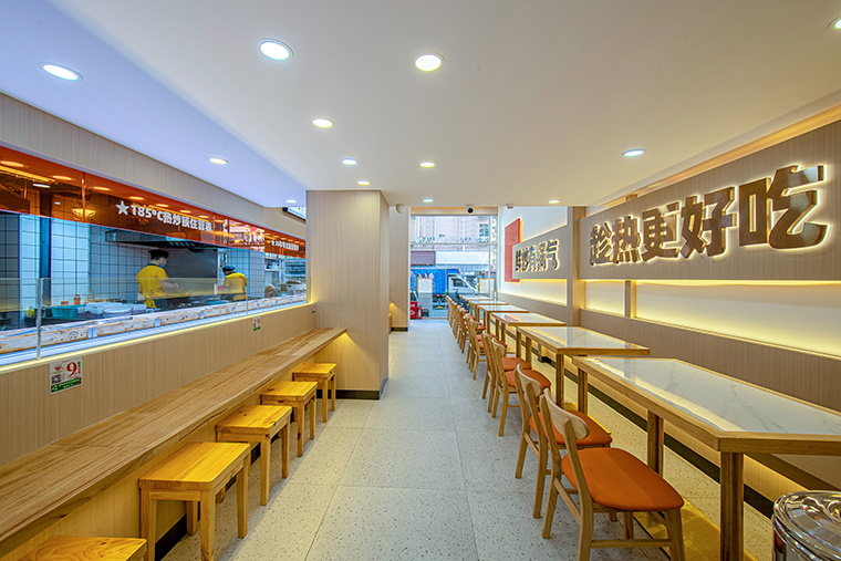 門口大面積落地玻璃、墻面使用板材、白色大理石打菜臺(tái)、灰色地面、木色桌面,橙色亞克力板。整個(gè)空間追求明亮、整潔、舒適的視覺感受。尤其是門口的落地玻璃,窗明幾凈,讓路過的消費(fèi)者都能看見店內(nèi)熱火朝天的狀態(tài),鍋氣繚繞的煙火氣,產(chǎn)生強(qiáng)烈的進(jìn)店沖動(dòng)。