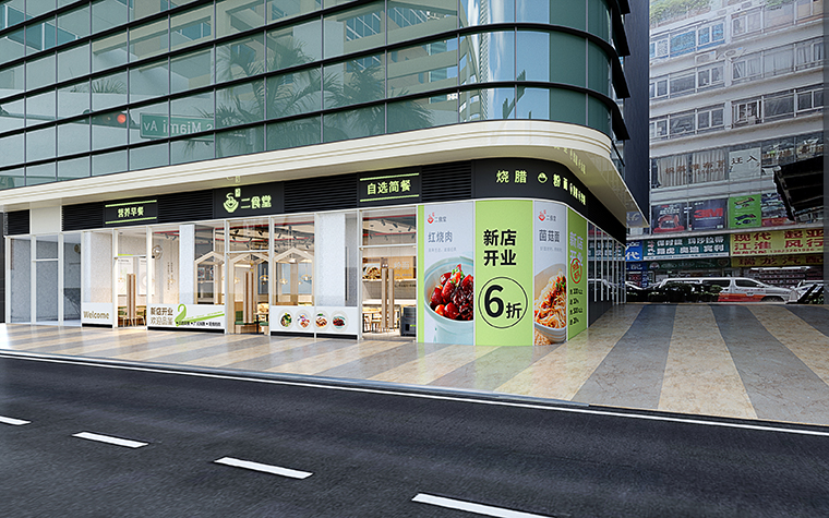 商務簡餐、現炒快餐空間裝飾裝修設計、快餐店門頭招牌設計、自選快餐餐線設計