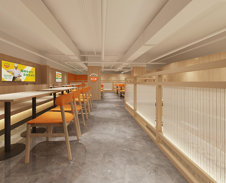 3、內(nèi)部使用大面積的橙色體現(xiàn)鮮炒有鍋氣的特點,橙色既使人產(chǎn)生一種陽光熱情的心里感受,又是現(xiàn)炒時火焰的顏色,體現(xiàn)了現(xiàn)炒的特性,識別度非常高。整面墻的木色板材,木色有自己獨特的質(zhì)感、在空間中又更有親和力,在狹窄的簡餐空間中也會讓人感受到輕松,給人一種可釋懷的愉悅,讓人隨時隨地都能感受到大自然的生機。