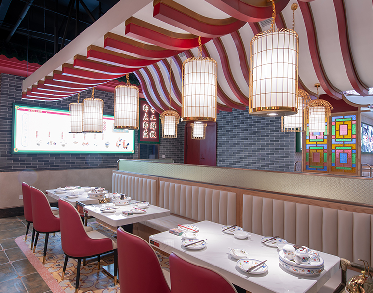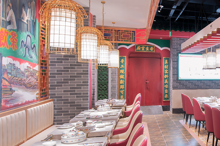 寶粵樓將嶺南園林古建筑的鑊耳山墻,廣式花窗引入整體空間裝飾中,大面積紅色、深綠色、廣式灰磚的搭配使用,將傳統廣州西關文化以時尚更精致的形式表現,為上海人民帶來了提溜鳥籠嘆早茶的“得閑飲茶”生活方式。